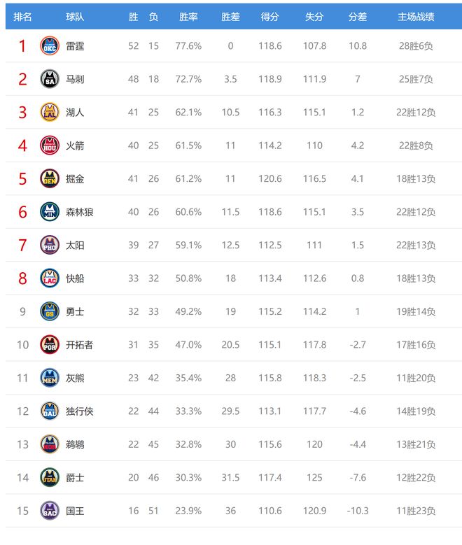 今日比赛后火箭、湖人排名互换,独行侠、鹈鹕排名互换,其他西部球队排名不变。