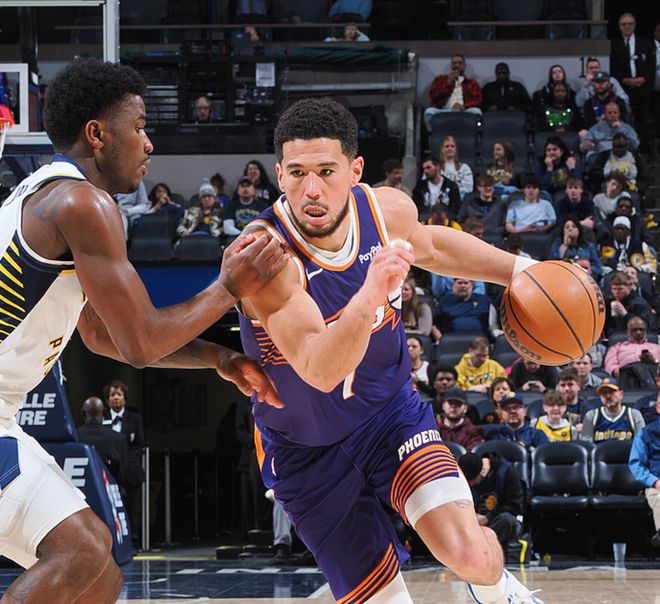 太阳客场挑战步行者,太阳方面狄龙、马威、阿伦缺阵,步行者方面哈利伯顿、西亚卡姆、内史密斯、麦康奈尔、托平缺阵,首节比赛双方平分秋色,从第二节开始太阳占据了上风,最终太阳123-108击败步行者。布克31中14(三分7中4)得到43分7板5助,杰伦格林23中14(三分9中3)得到36分3板4助3断,步行者方面内姆哈德7中6(三分2中2)得到23分2助。