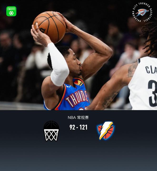 第四节篮网钱尼-约翰逊拿下10分,雷霆以赛亚-乔拿下11分,最终篮网92-121不敌雷霆