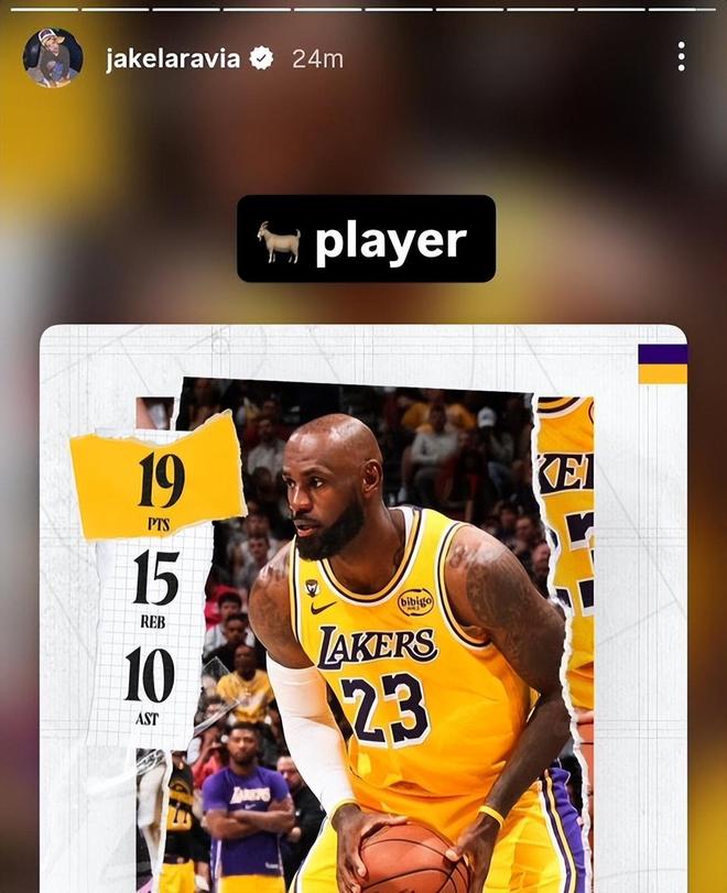 赛后,湖人的拉拉维亚更新了自己的社媒,转发了本场比赛詹姆斯的数据,并写道:“GOAT!”