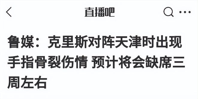 虽然山东男篮本赛季的整体表现还算不错,目前在积分榜上位列四强。不过从表现来看,自从进入第二阶段后,球队的状态就有些低迷,先后输给了广州男篮、浙江男篮和上海男篮,只是拿到了六场比赛中的三场胜利。就在日前,山东体育记者徐凯华透露,山东男篮大外援克里斯在和天津男篮的比赛中出现了手指骨裂的情况,预计要缺席三周到四周的时间,常规赛基本报销。