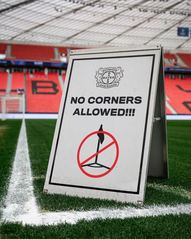 勒沃库森官方社交媒体晒出趣味照片,主场角旗区被贴上“禁止罚角球”标识,并且配文“值得一试”,调侃阿森纳超强的角球得分能力。