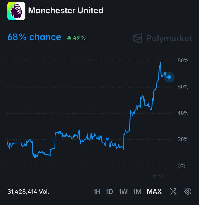 据一项专业研究分析,在切尔西周六主场0-1不敌纽卡斯尔联之后,曼联本赛季跻身英超前四的可能性,已经提升到68%,接近七成机会重返欧冠。英超前四铁定会获得欧冠资格,第五名也有很大概率可以踢欧冠。