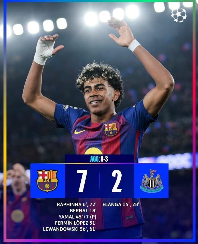 - 2026年03月19日 狂胜!巴萨7-2纽卡总比分8-3进八强 拉菲造5球莱万双响亚马尔传射