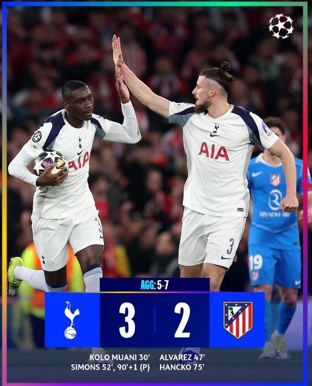 - 【欧冠】西蒙斯双响制胜热刺,小蜘蛛传射护马竞晋级