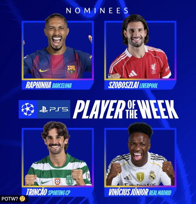 本周欧冠最佳球员候选:拉菲尼亚、索博、特林康、维尼修斯